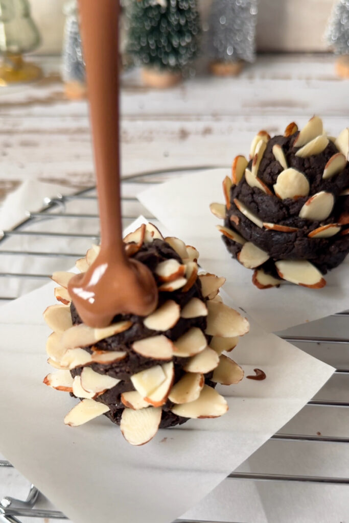 Decorate – Press slivered almonds around each pinecone to mimic scales. If they soften while working, pop them back in the fridge for a few minutes.