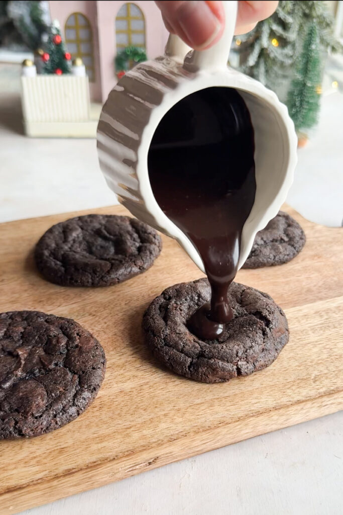 - Once cookies are cooled slightly … but still warm. Gently press a tablespoon sized indent in the top of each cookie and spoon or pour the ganache into the indent.