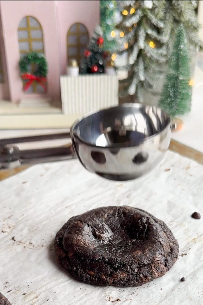 - A high amount of dark, melted chocolate adds richness and structure. As it cools, it firms up the cookie, helping it stay thick instead of spreading flat.