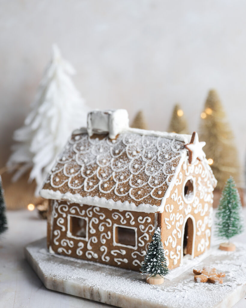 Use white royal icing scrollwork, candy canes, sprinkles, snowy coconut flakes or a dusting of icing sugar. Food-safe shimmer dust, peppermint windows, and gingerbread cookie trees or fences can embellish your house beautifully.